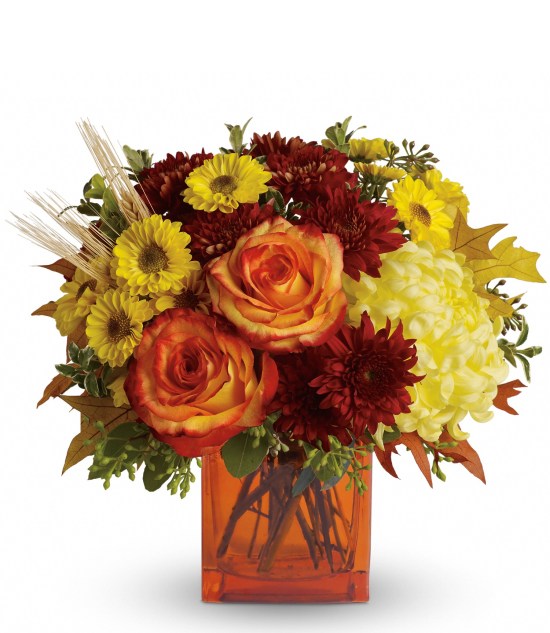 The stylish contemporary arrangement includes yellow cushion spray chrysanthemums, bi-color orange roses, rust cushion spray chrysanthemums, yellow disbud chrysanthemum and yellow spray chrysanthemums accented with assorted greenery.