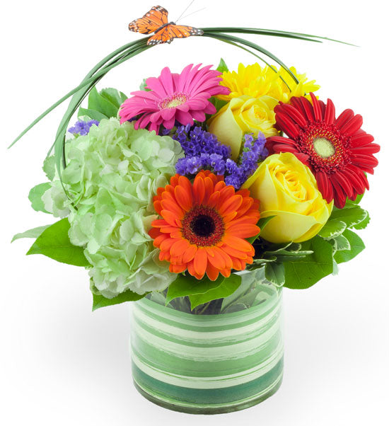 Roses, gerbera, and hydrangea are delivered in a cheerful clear glass vase, lined with variegated greens.