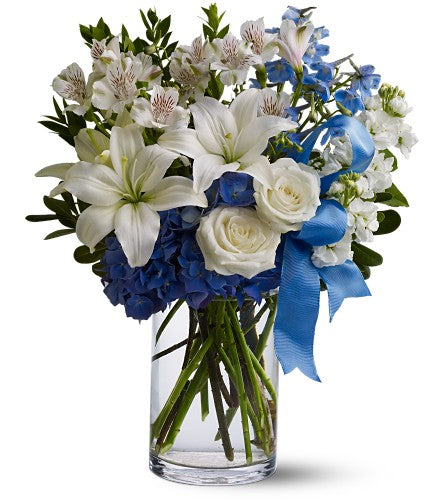 A mix of fresh blue and white flowers such as delphinium, roses, Asiatic lilies and more are accented with greenery and a blue ribbon.