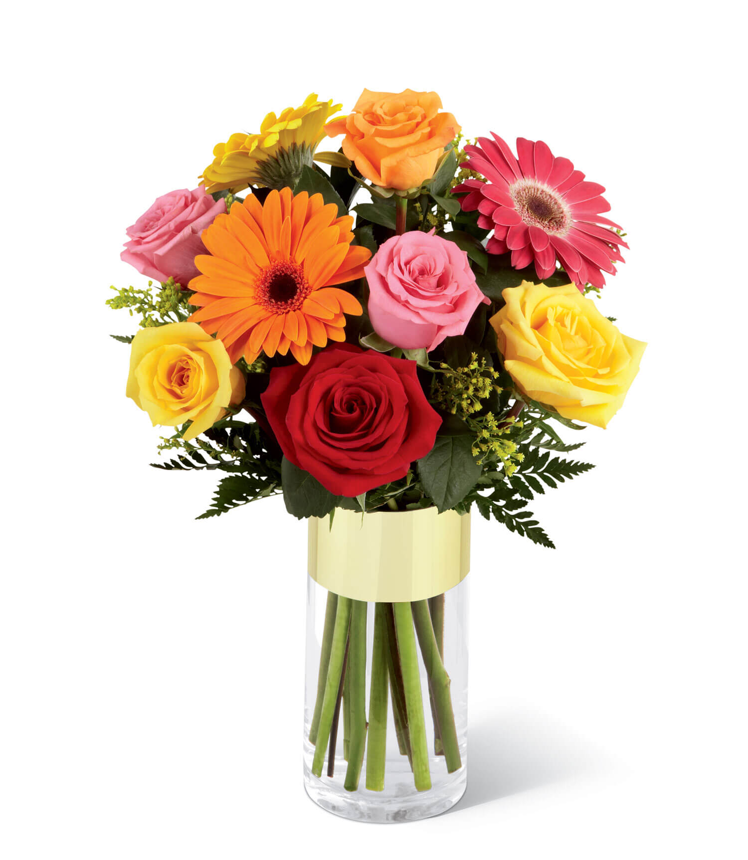 Assorted roses and gerbera daisies in their most brillliant hues create a stunning bouquet accented with yellow solidago and assorted greens.