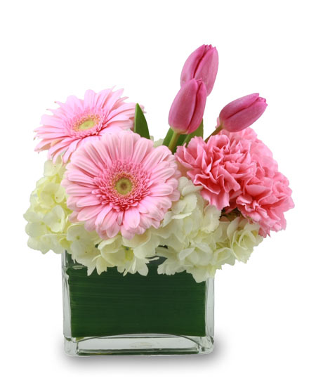 Filled with gorgeous pink seasonal flowers and white hydrangeas. All in a leaf-lined glass cube vase.